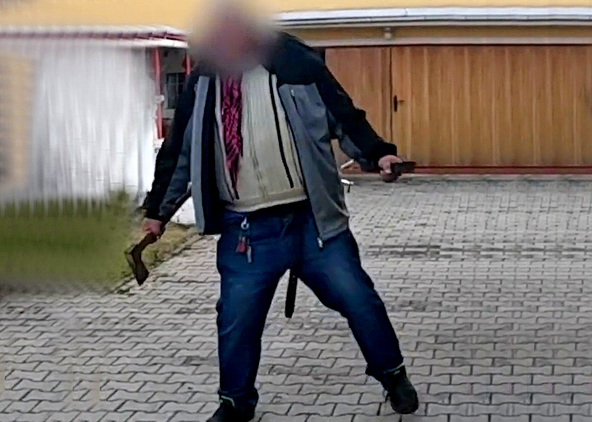 Když hlídka dorazila na místo, oslovila podezřelého muže stojícího ve dvoře. Ten však reagoval nebezpečně. Do jedné ruky vzal sekeru, do druhé velký nůž, a pomalu se rozešel směrem k policistům. Ti ho opakovaně vyzývali, aby svého jednání zanechal a zbraně odložil. Muž ale na výzvy nereagoval a dál se k nim pomalým krokem přibližoval.