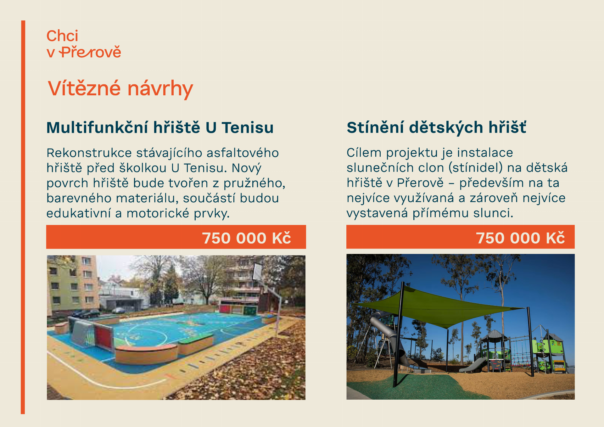 Přerované opět ukázali, že chtějí město, kde se dobře žije – především dětem. V letošním ročníku participativního rozpočtu Chci v Přerově zvítězily dva projekty: multifunkční hřiště U Tenisu a zastínění dětských hřišť. O výsledku rozhodlo 1 438 hlasujících, kteří vybírali ze sedmnácti návrhů občanů.